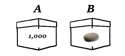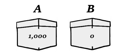 open boxes A and B, where A contains $1,000 and B contains nothing. The amounts in the boxes are