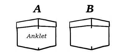 Suppose that the gifts in question are an anklet (A) and a bracelet (B): the father is letting his daughter choose one of these as a birthday gift. For our purposes, imagine that the father presents his daughter with two gift-wrapped boxes, e.g., as pictured above. (He has purchased both gifts in advance and has wrapped each in a box of its own.) The boxes are labelled A and B, with the obvious meanings, and the daughter is invited to choose between the anklet and the bracelet by picking the appropriately-labelled box.
