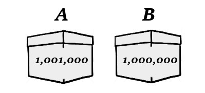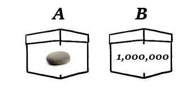 What then are you choosing between, in choosing between box A and box B? Given everything I have said, the answer is forced upon us: you are choosing between a thousand dollars and a million. We can make this clear by identifying the “irrelevant” amounts in the boxes and replacing them (for the moment) with stones. We then get the following case, which is not quite Newcomb’s problem, but a useful intermediary:
